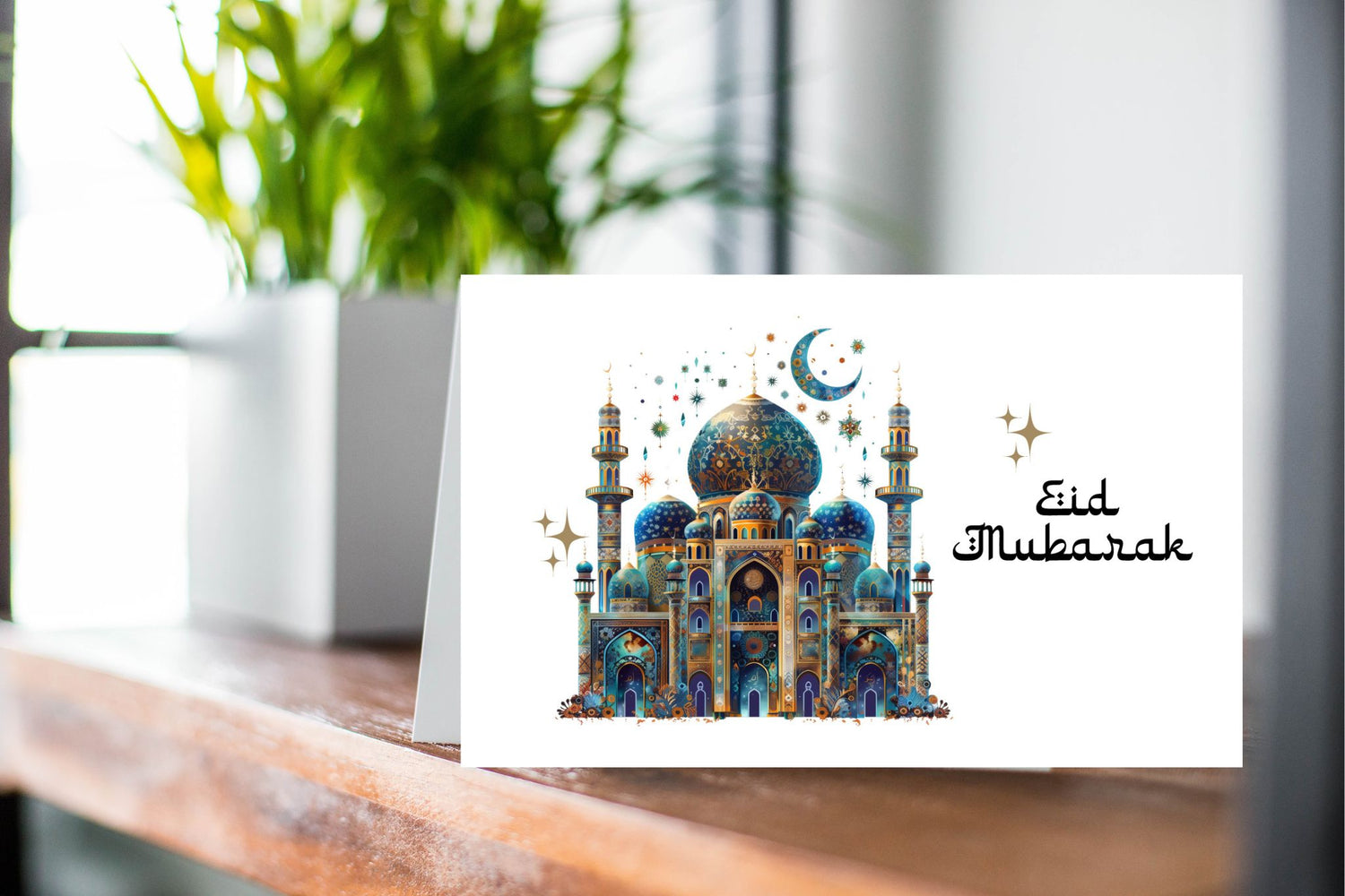 Celebrate Eid with this elegant greeting card featuring a beautifully illustrated mosque adorned in rich blue and gold tones, accented with celestial details. Designed to honor the joy, spirituality, and cultural beauty of Eid, this card offers a timeless and respectful way to share warm wishes with loved ones. Blank inside for a personal message.